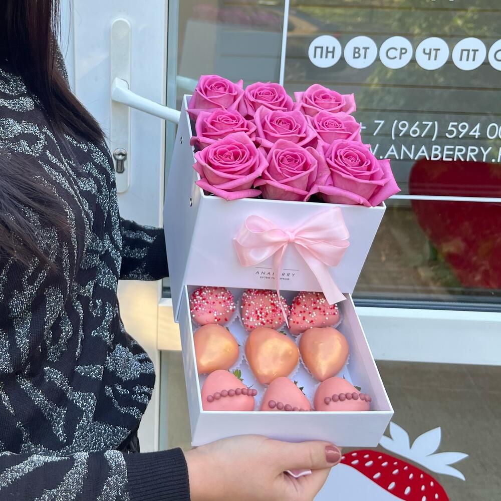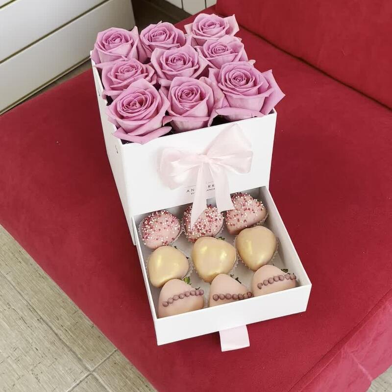 Мини шкатулка с кустовыми розами (9 клубничек в шоколаде)