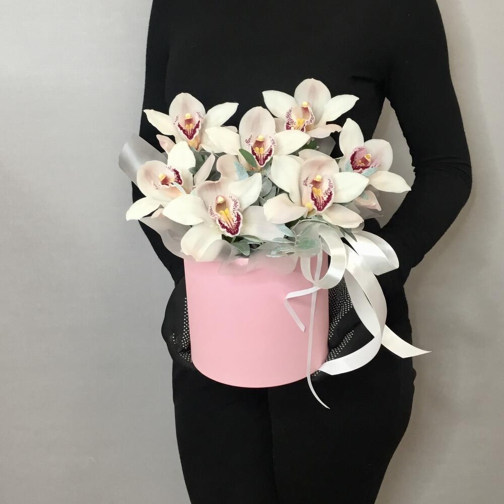 Лента атласная – 1 шт.Оазис флористический – 1 шт.Цимбидиум белый – 7 шт.фисташка крашенная – 3 шт.коробка шляпная 16х16 – 1 шт.