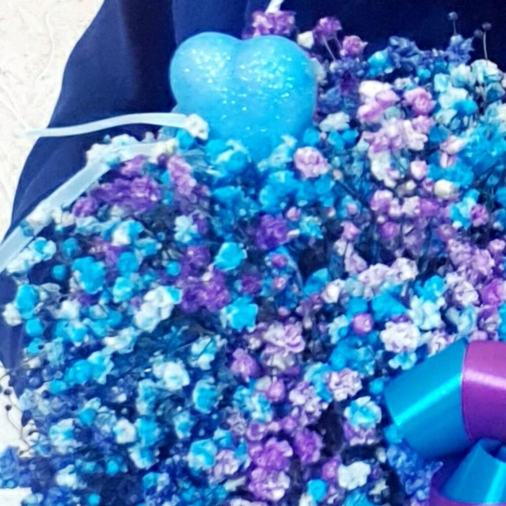 Лента атласная – 2 шт.Топпер сердце – 1 шт.гипсофила радужная – 6 шт.сумочка картонная с ручкой в ассортименте. – 1 шт.