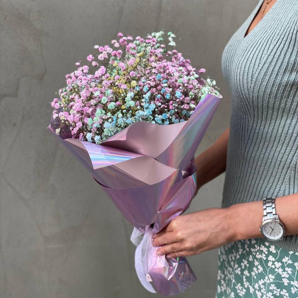 Лента атласная – 1 шт.Упаковка дизайнерская – 1 шт.Открыточка с вашими пожеланиями – 1 шт.гипсофила радужная – 5 шт.любовь флориста (бесплатно) – 1 шт.
