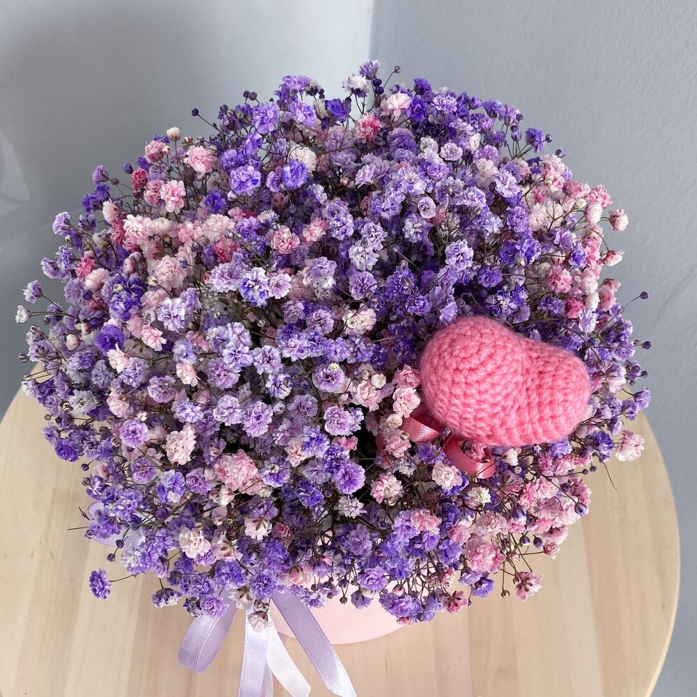гипсофила крашенная – 7 шт.топпер вязанный «сердце» – 1 шт.Шляпная коробка – 1 шт.