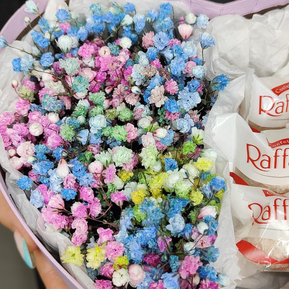 гипсофила радужная – 3 шт.Конфеты Raffaello – 5 шт.Коробка сердце – 1 шт.Губка флористическая – 1 шт.Тишью белое – 1 шт.