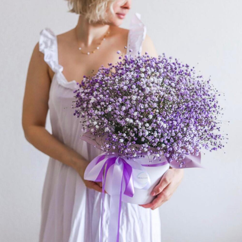 “Сиреневый туман” – композиция из гипсофилы в шляпной коробке