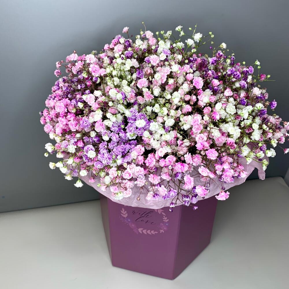 гипсофила радужная – 9 шт.Коробка шляпная – 1 шт.Тишью – 2 шт.Оазис флористический – 1 шт.Пленка прозрачная – 1 шт.Лента атласная – 2 шт.