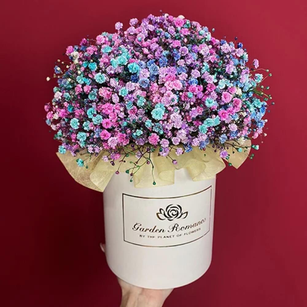 Оазис флористический – 1 шт.гипсофила радужная – 11 шт.шляпная коробка 16 на 21 – 1 шт.