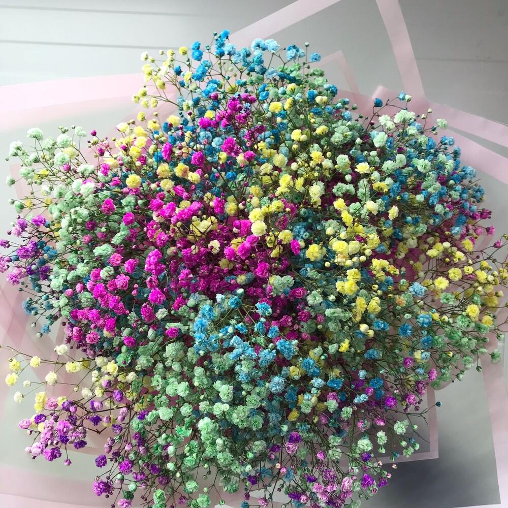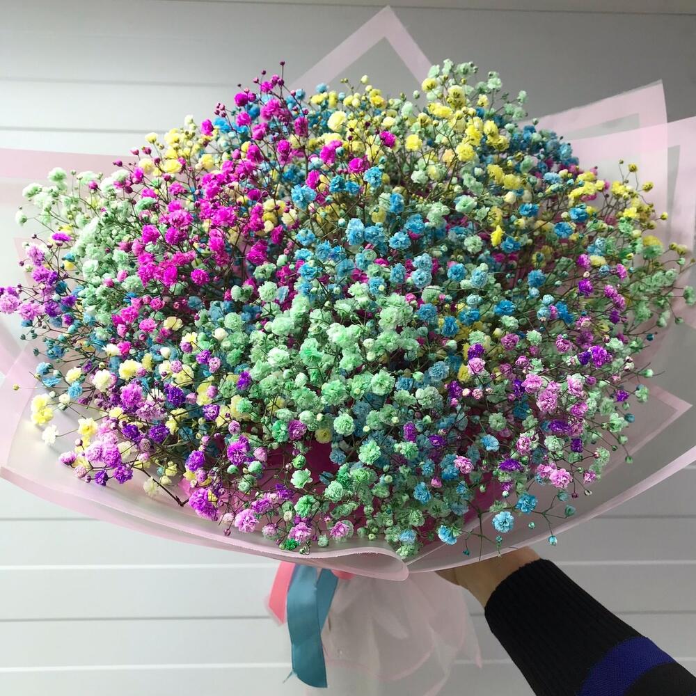 гипсофила радужная – 11 шт.Упаковка дизайнерская – 2 шт.Лента атласная – 1 шт.