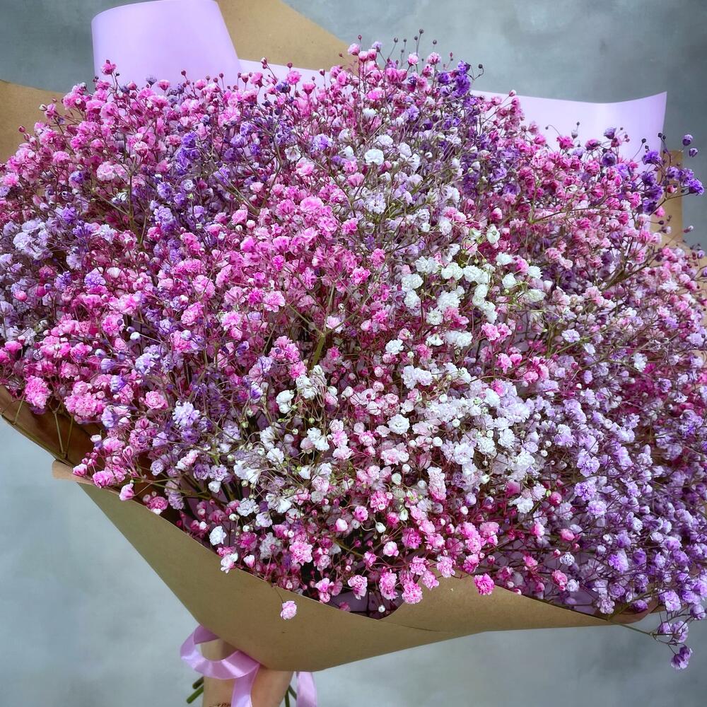 Охапка разноцветной гипсофилы – белой, розовой, фиолетовой – в стильном крафте. Подойдёт в подарок маме, жене, девушке, коллеге. Произведет яркое впечатление!