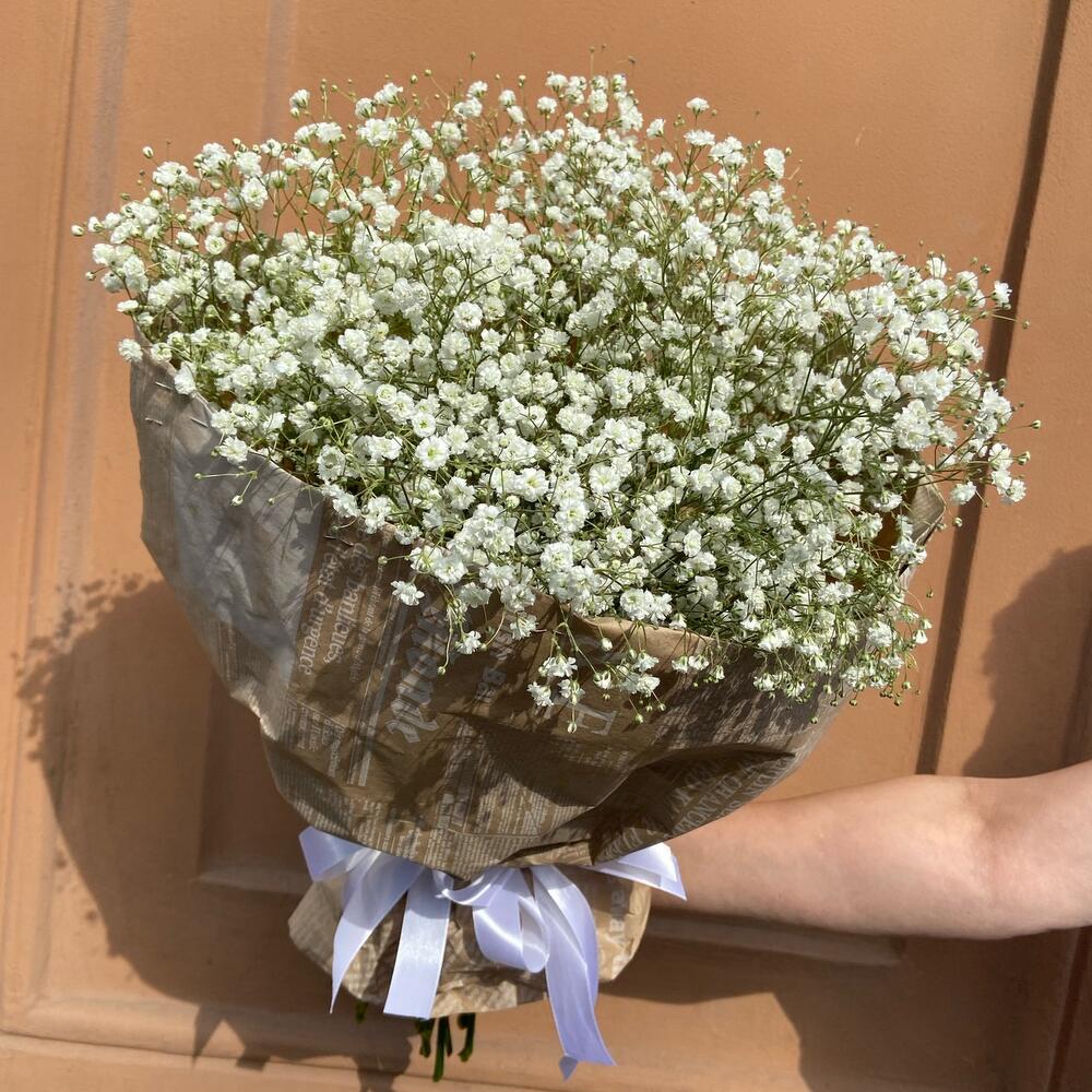 Гипсофила – 11 шт.Упаковка дизайнерская – 3 шт.Лента атласная – 1 шт.