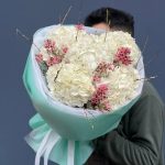 Гортензия – 5 шт. фисташка зелень – 7 шт. Хамелациум – 3 шт. Упаковка дизайнерская – 6 шт. Лента – 1 шт.