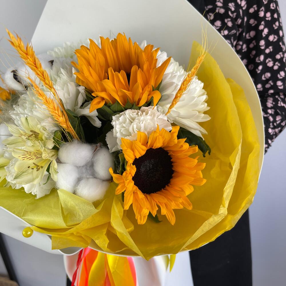Альстромерия – 1 шт.Хлопок – 3 шт.Лента атласная – 2 шт.Диантус – 3 шт.Подсолнух – 3 шт.Упаковка дизайнерская – 2 шт.Стифа – 1 шт.Пшеница (сухоцвет) – 3 шт.антонов – 3 шт.