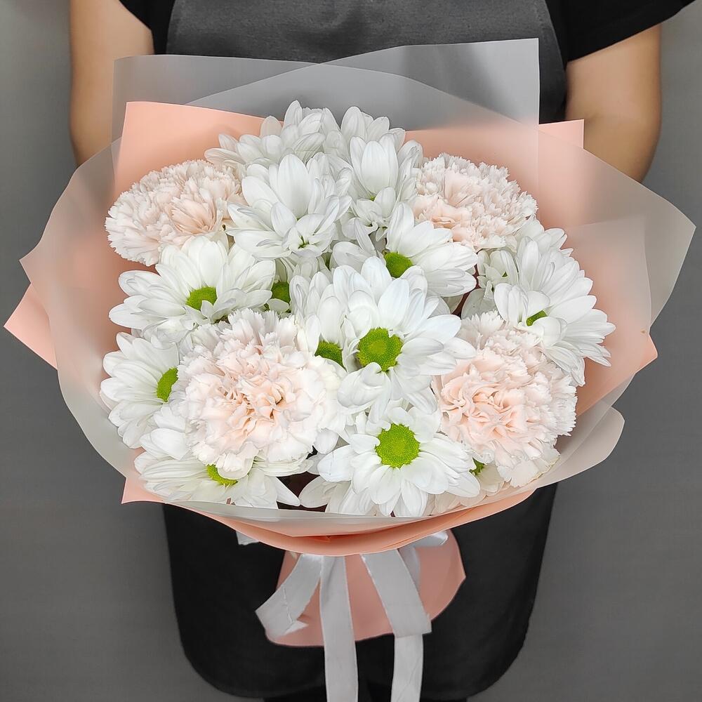 Лента атласная – 1 шт.Диантус – 4 шт.Хризантема кустовая ромашковая белая – 3 шт.упаковка флористическая – 1 шт.