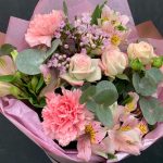 Букет с альстромериями, кустовой розой, гвоздикой и ваксфлауэром