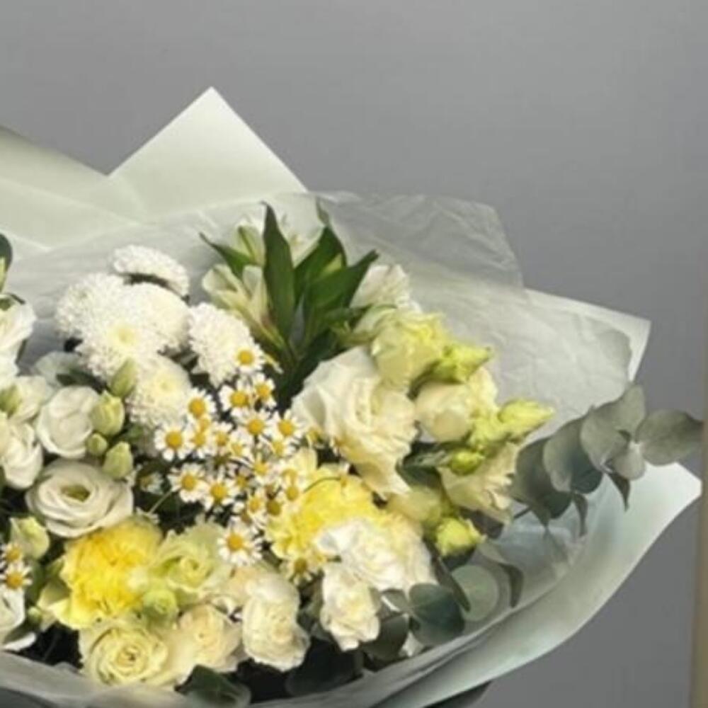 Альстромерия – 2 шт.Лизиантус – 5 шт.Хризантема Сантини – 3 шт.Гвоздика – 3 шт.Матрикария – 3 шт.Упаковка дизайнерская – 1 шт.
