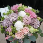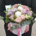 Бархатный цилиндр из голубых диантусов, розовых пионов и ароматной маттиолы