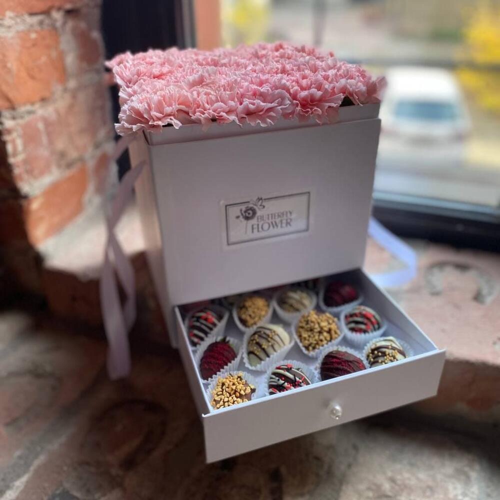 Коробка с гвоздикой и клубникой в шоколаде «Диантус и клубника»