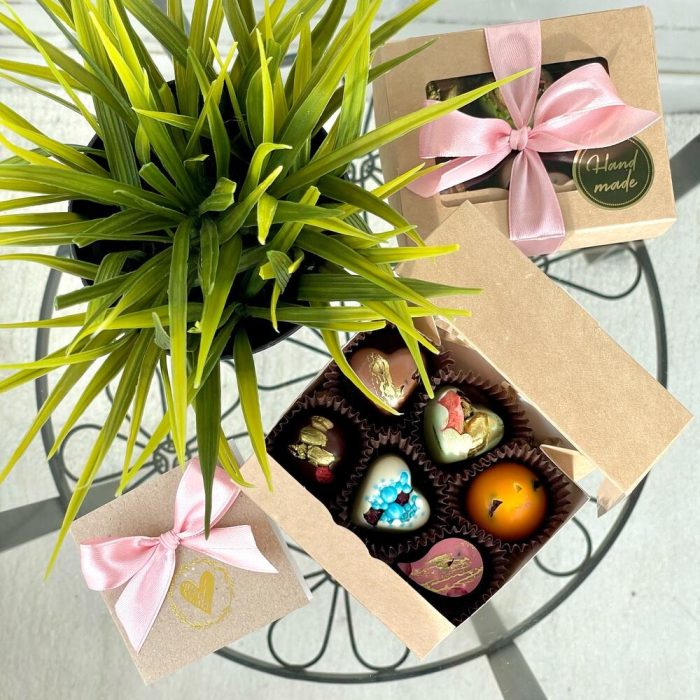 медианты из бельгийского шоколада ручной работы – 6 шт.Шоколадные конфеты ручной работы – 6 шт.мед-суфле со вкусом малины – 40 гр.мед-суфле со вкусом голубики – 40 гр.открытка с вашими пожеланиями – 1 шт.
