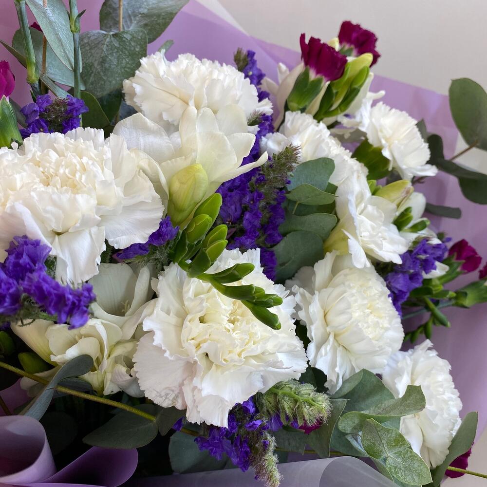 Гвоздика белая – 7 шт.Гвоздика кустовая – 5 шт.фрезия ароматная белая голландия – 6 шт.Зелень – 5 шт.Статица синяя – 4 шт.Упаковка с атласной лентой – 5 шт.