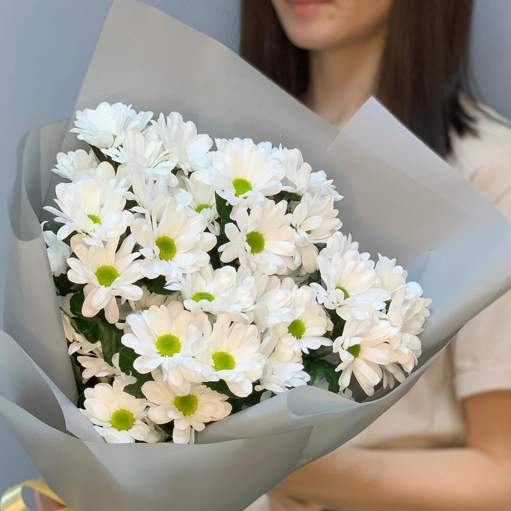 Красиво оформленный лаконичный букет ромашек (хризантем) подойдет для любовного повода: свидание , день рождения , подарок подруге.