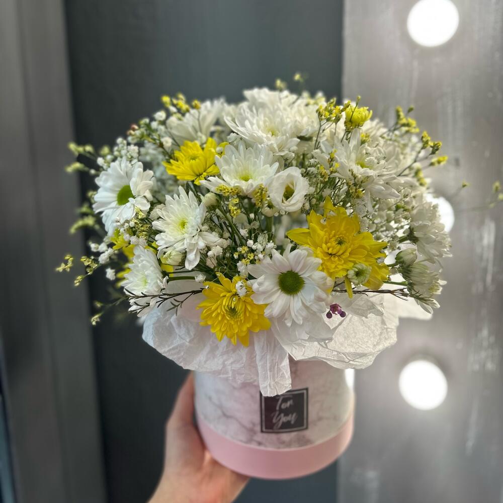 Хризантема кустовая – 7 шт.Гипсофила – 3 шт.Лимониум – 4 шт.Тишью – 3 шт.Оазис флористический – 2 шт.Коробка шляпная – 1 шт.
