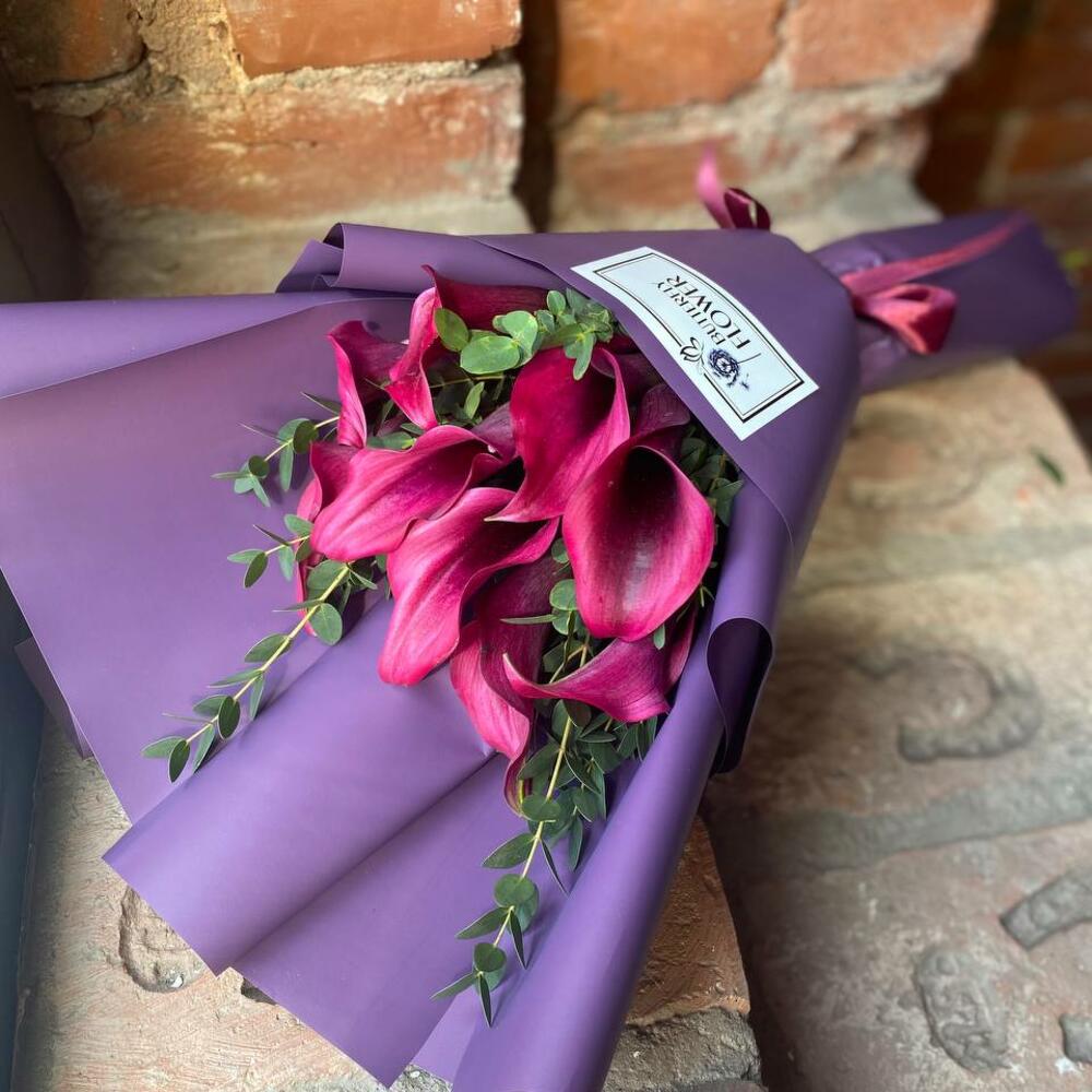 Букет из 9 розовых калл с эвкалиптом в упаковке “Перо Павлина”