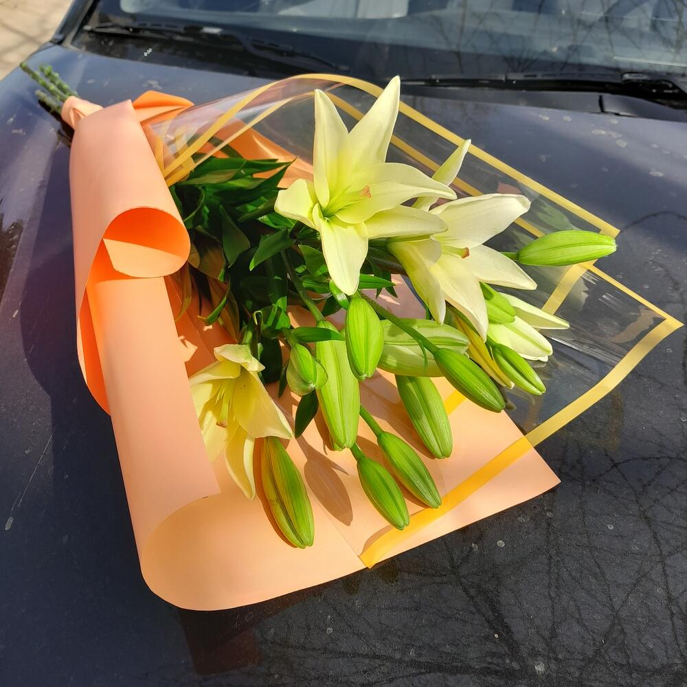 Лилия Азиатская белая – 3 шт.Упаковка дизайнерская – 3 шт.Лента атласная – 2 шт.
