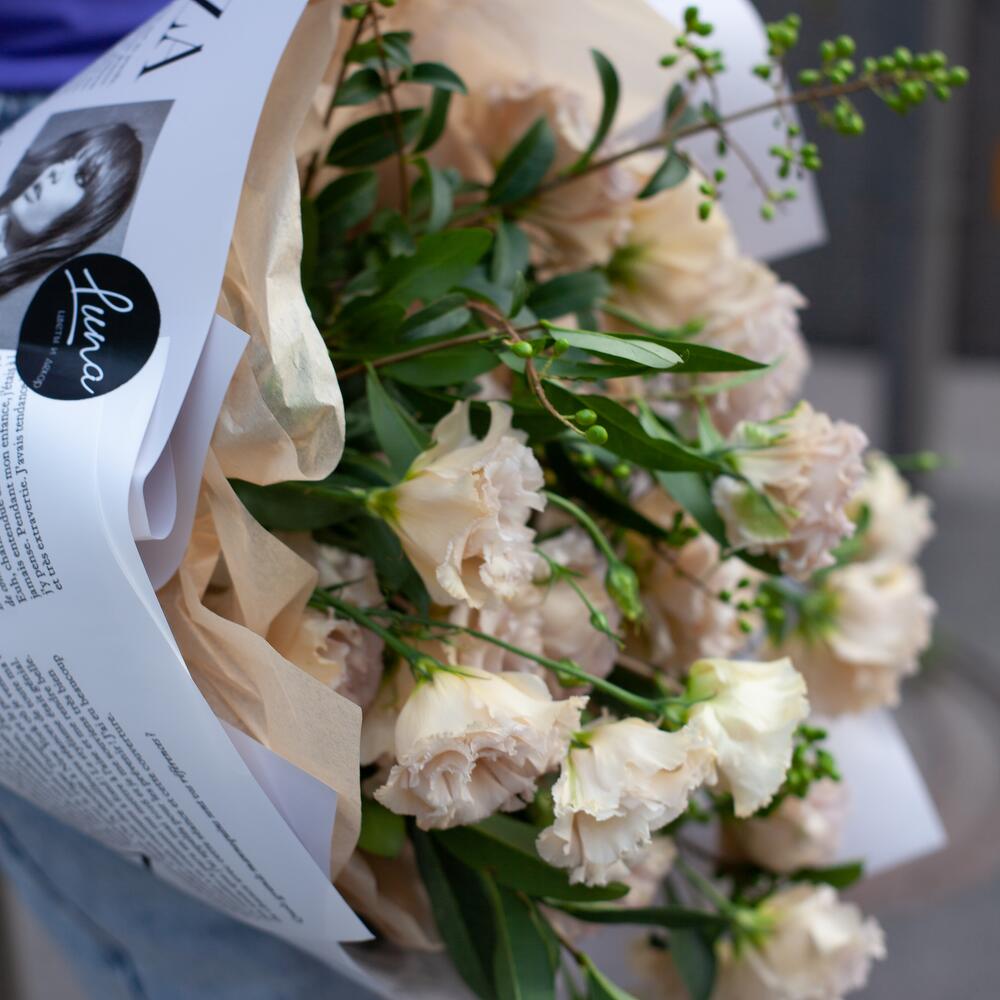 Лизиантус – 7 шт.зелень ягодная – 4 шт.Упаковка дизайнерская – 1 шт.