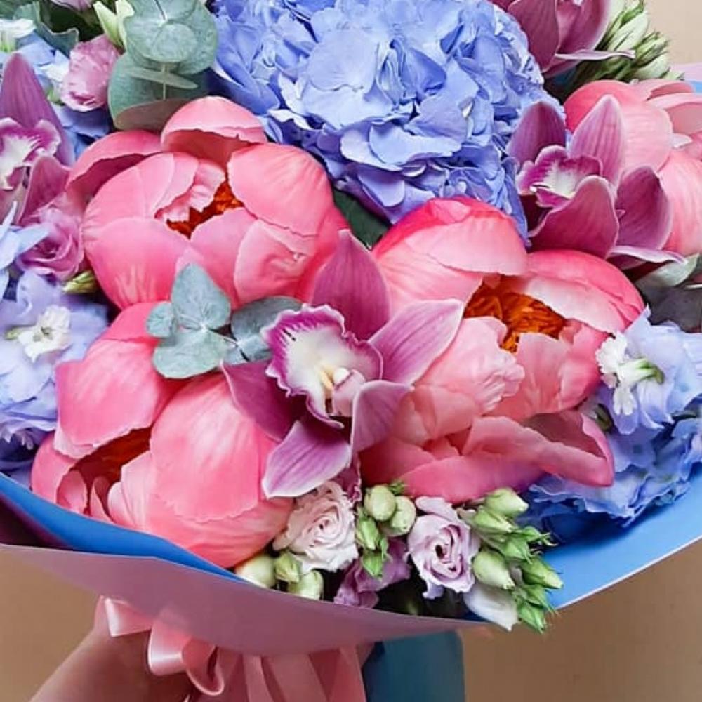 Гортензия – 1 шт.Эустома – 5 шт.Орхидея Цимбидиум – 5 шт.пион или ранункулюс – 5 шт.Дельфиниум – 5 шт.Эвкалипт – 2 шт.Упаковка – 3 шт.Лента атласная – 2 шт.