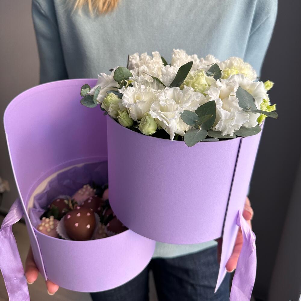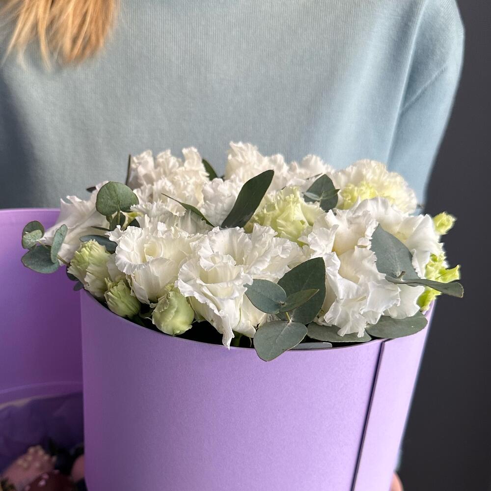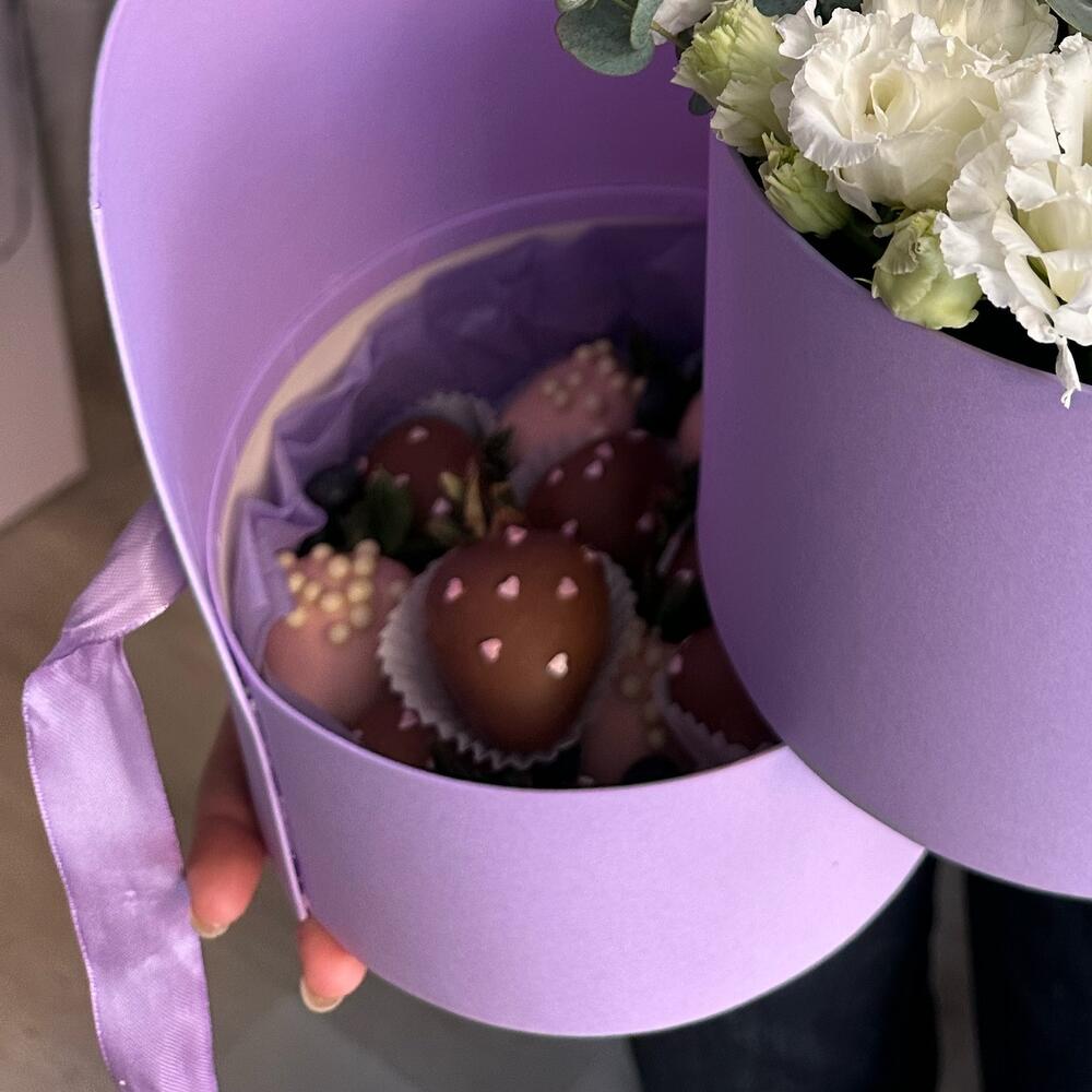 Эустома – 5 шт.Голубика – 20 шт.Эвкалипт Baby Blue – 1 шт.Клубника в шоколаде callebaut (бельгия) – 15 шт.