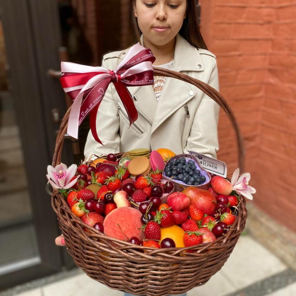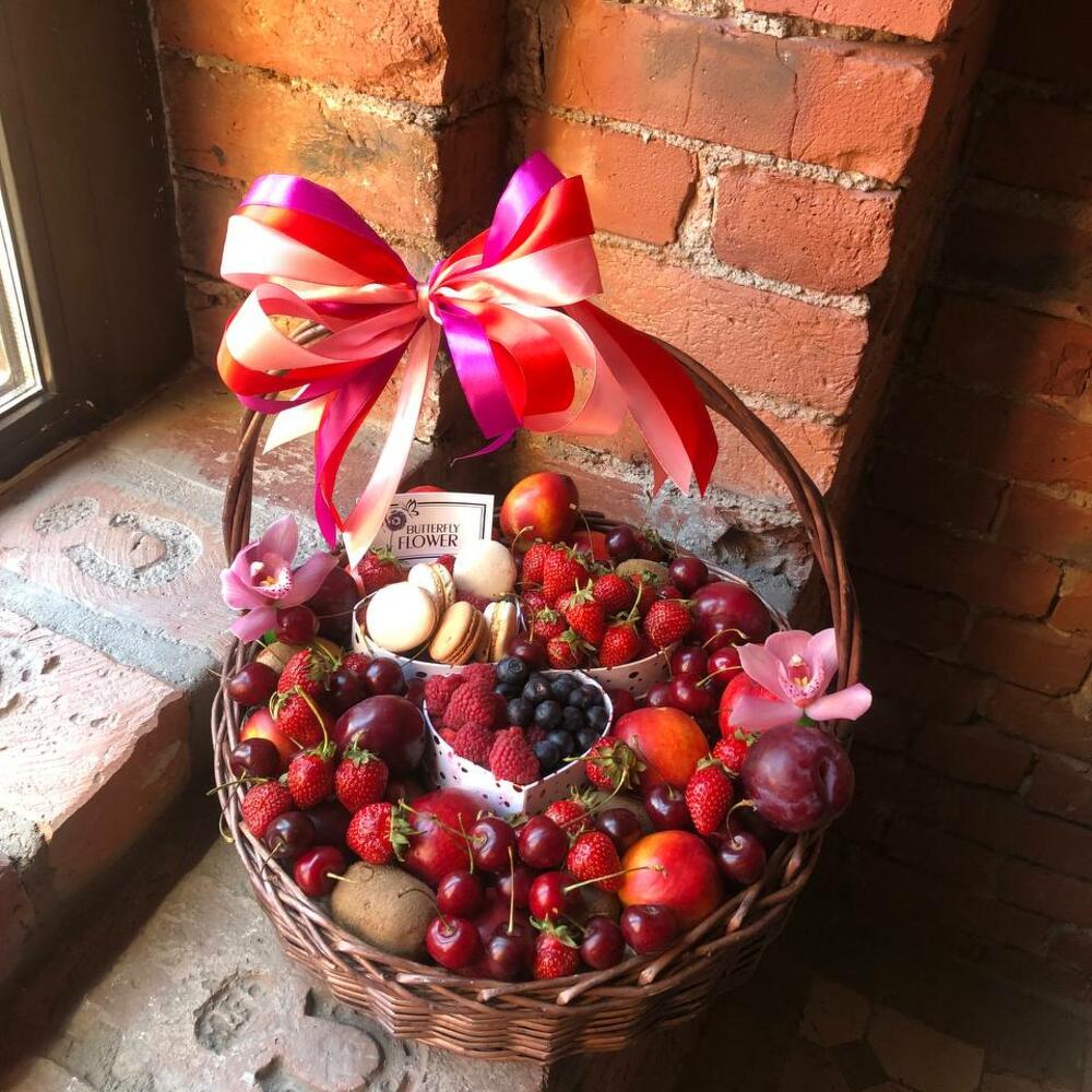 Корзинка с ягодами, фруктами и макаруни – идеальный подарок по любому поводу и вовсе без повода. Ведь все любят вкусняшки))Магазин оставляет за собой право на замену сезонных товаров и аксессуаров, если это не отразится на стоимости и внешнем виде композиции. Количество ягод указано в граммах.
