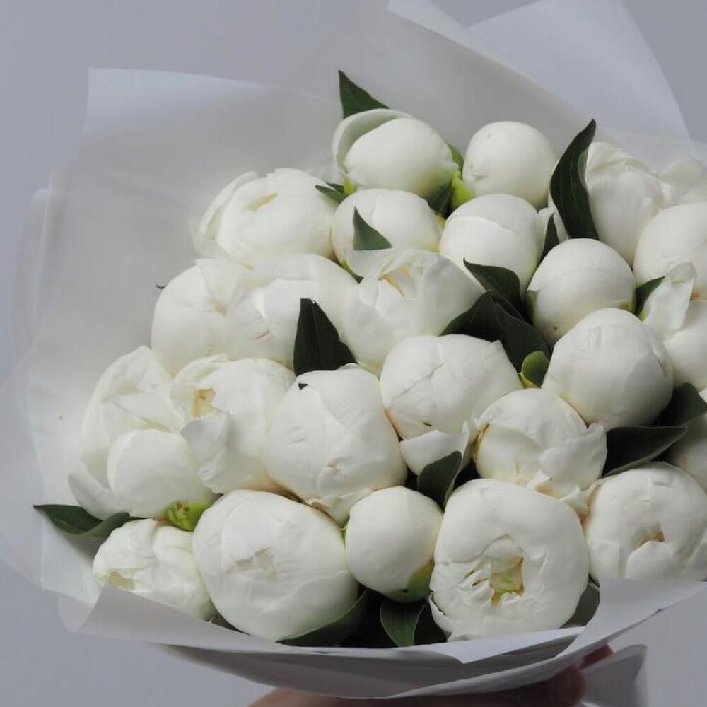 Пион белый – 25 шт.Упаковка дизайнерская – 1 шт.Лента атласная – 2 шт.Открыточка с вашими пожеланиями – 1 шт.хорошее настроение – 100 шт.инструкция по уходу за цветами – 1 шт.коробка переноска – 1 шт.Кризал – 1 шт.