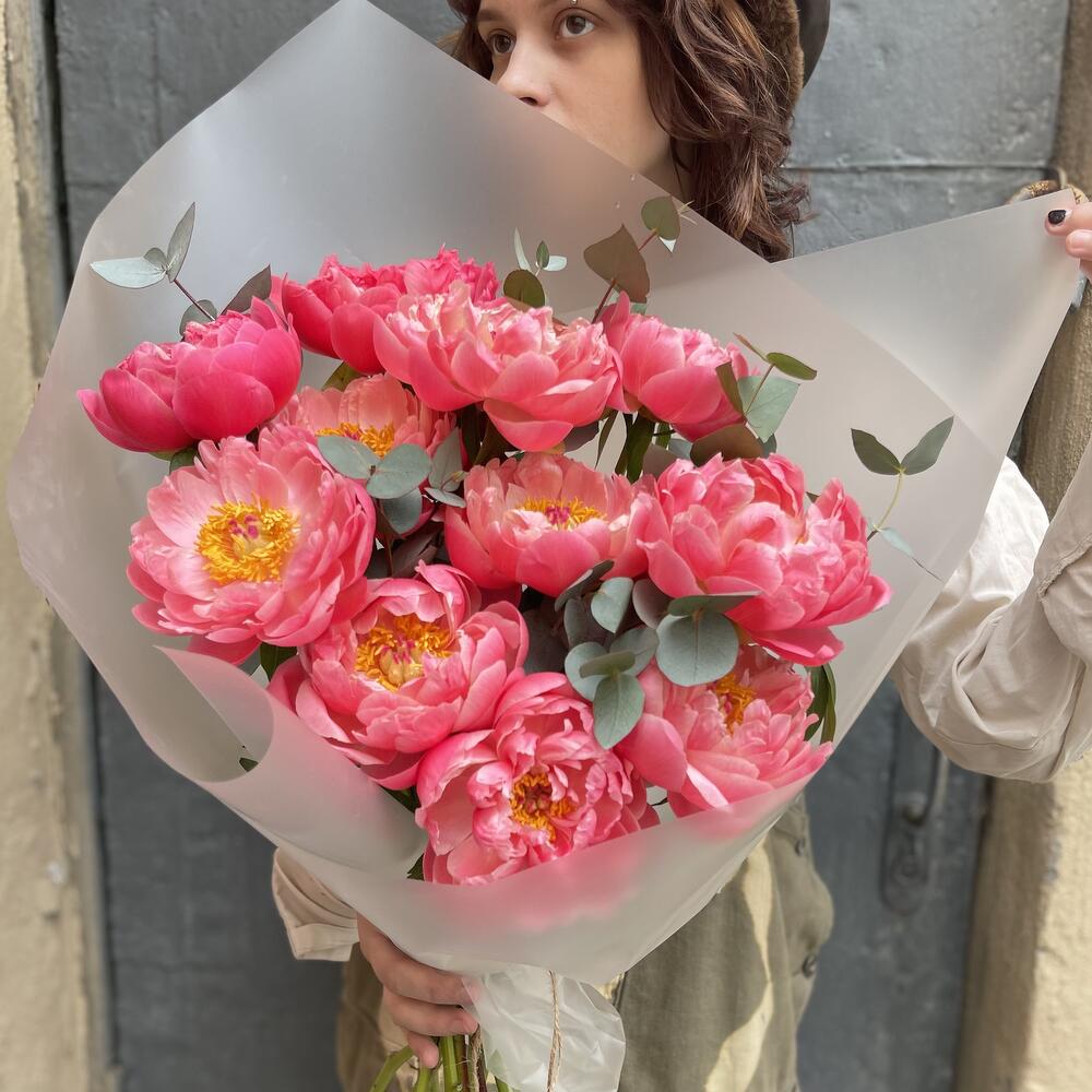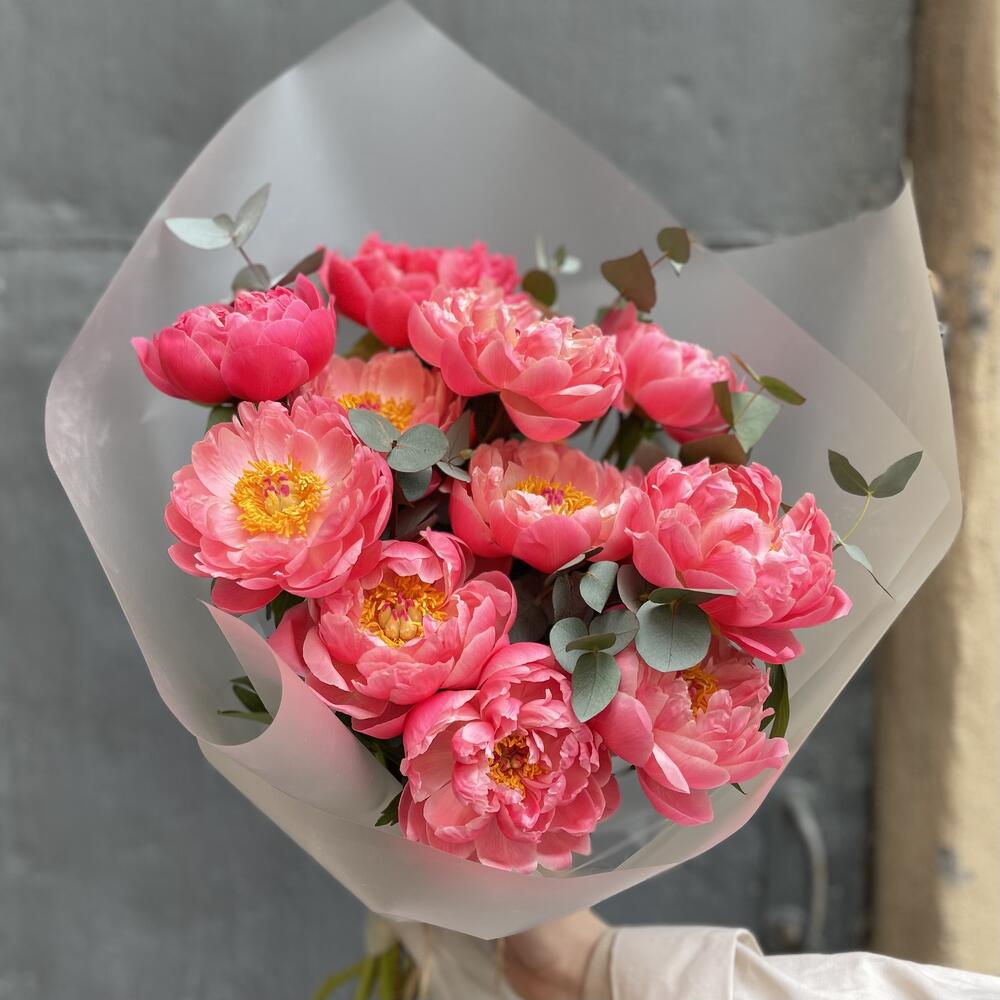 Пион – 11 шт.Эвкалипт – 2 шт.Упаковка дизайнерская – 1 шт.