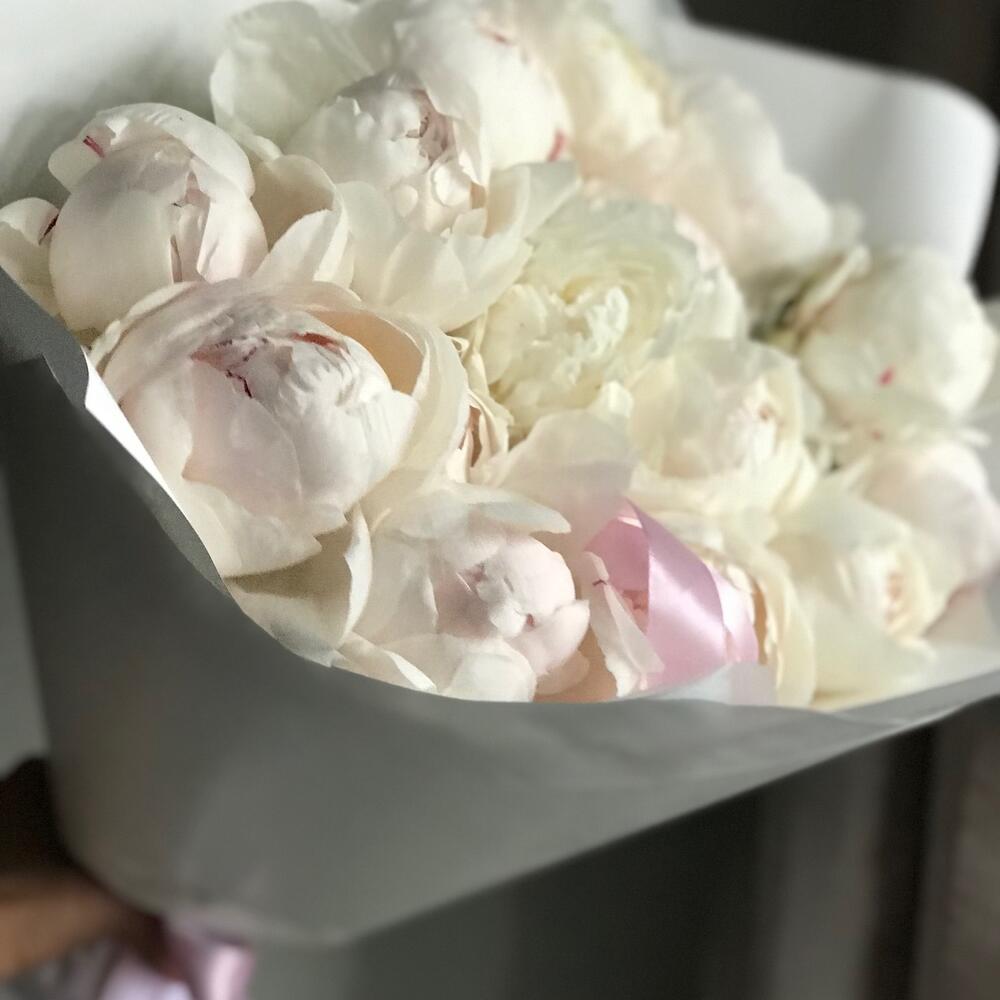 Лента – 3 шт.Пион белый – 15 шт.Упаковка дизайнерская – 5 шт.