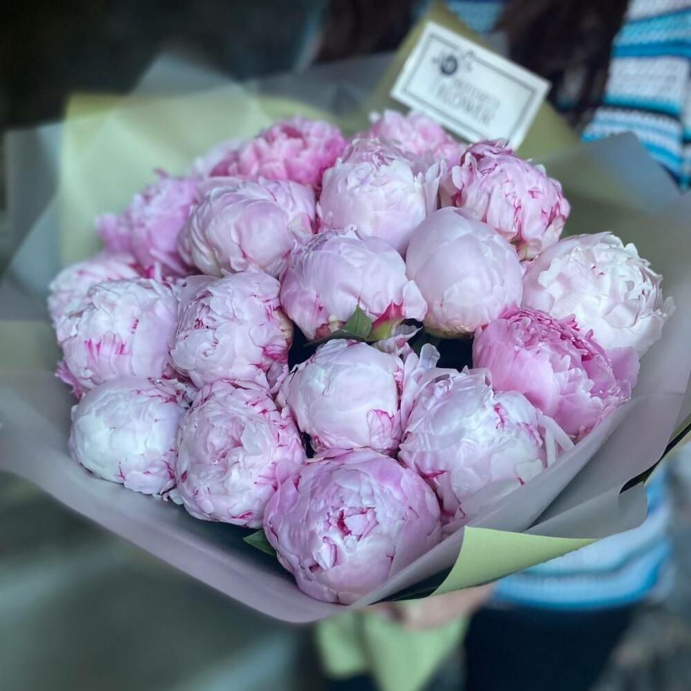Букет из 19 розовых пионов в дизайнерской упаковке “Джордж Сайрус”