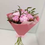 пионы сара бернар – 5 шт.зелень фисташки – 1 шт.Дизайнерская упаковка – 1 шт.