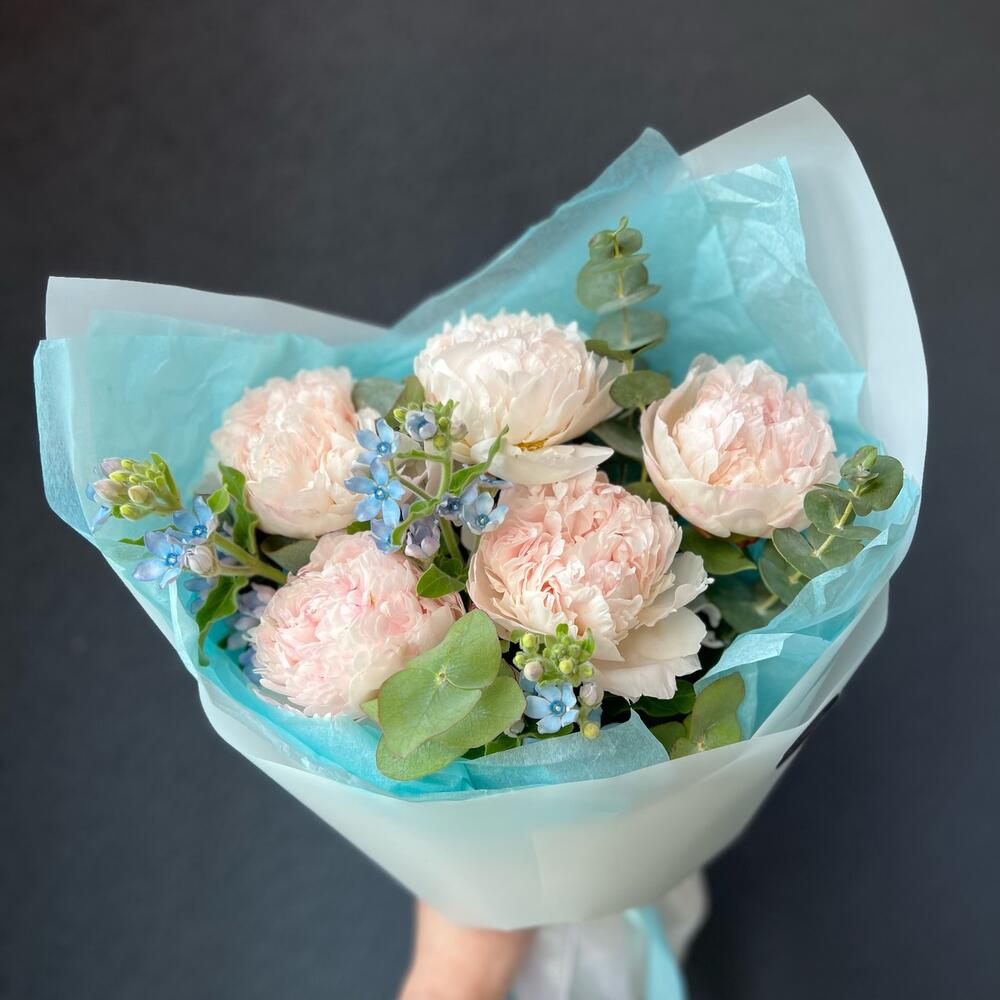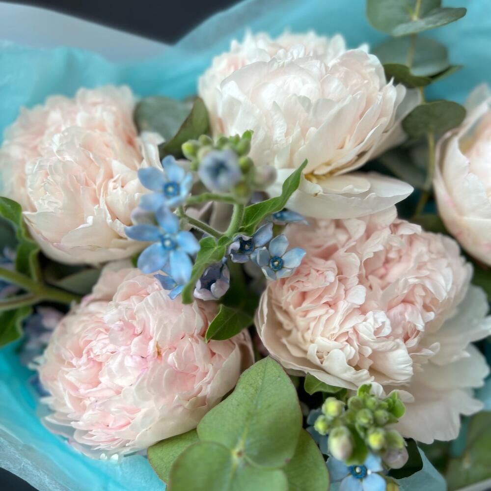 Пион – 5 шт.Эвкалипт – 2 шт.Атласная лента – 1 шт.Оксипеталум – 3 шт.декоративная упаковка – 1 шт.