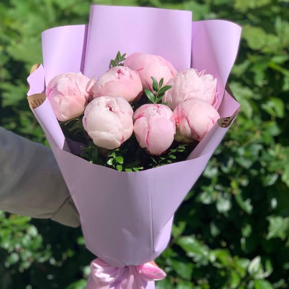 Букет розовых пионов в дизайнерской упаковке 7 шт