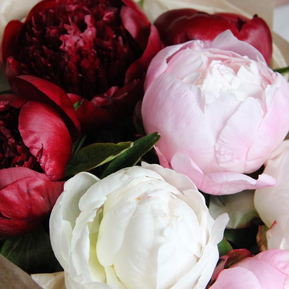 Букет из бордовых, розовых и белых французских пионов в лаконичной упаковке.Стильное цветочное решение для любого случая.
