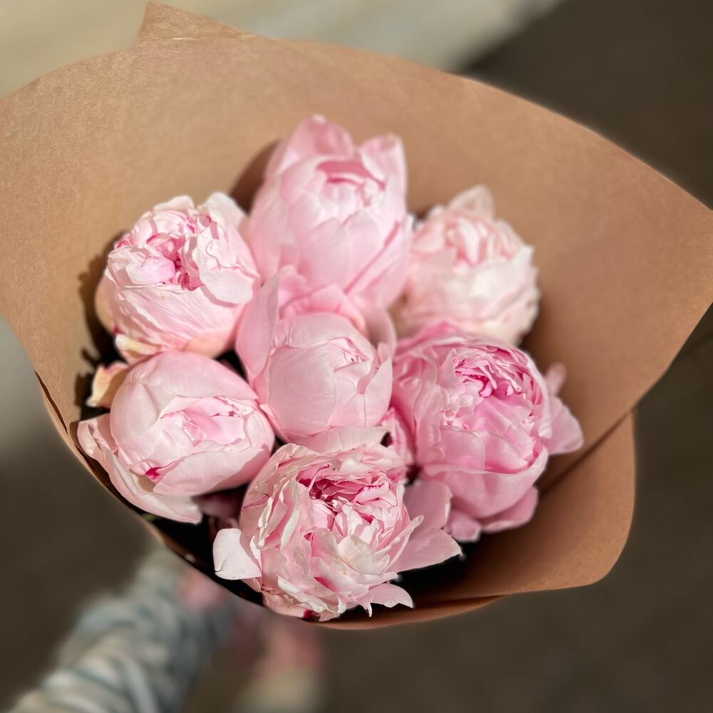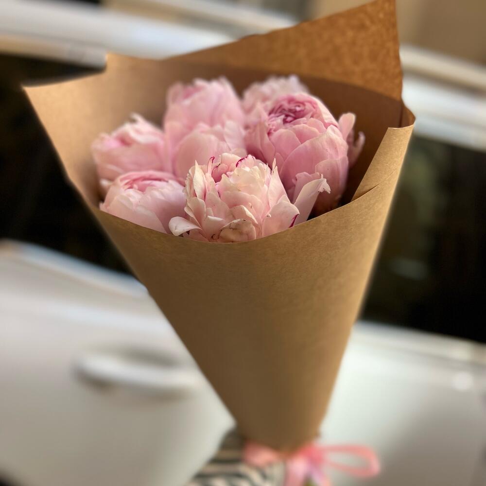 Лента атласная – 1 шт.Крафт упаковка – 2 шт.пион розовый рене – 7 шт.