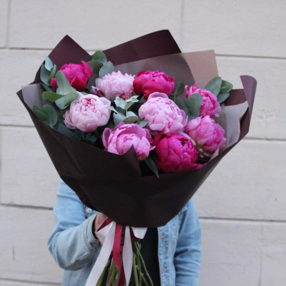Эвкалипт – 7 шт.Упаковка – 2 шт.Лента атласная – 2 шт.Пион Голландия – 9 шт.