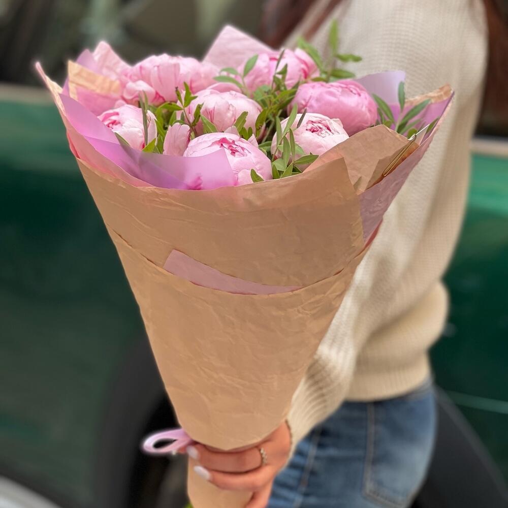 Упаковка – 2 шт.Лента атласная – 2 шт.Фисташка – 3 шт.Пион Сара Бернар – 7 шт.