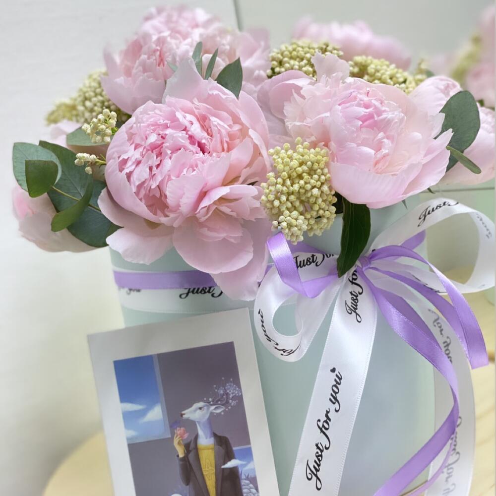 Озотамнус – 5 шт.Эвкалипт – 1 шт.Лента атласная – 2 шт.Коробка шляпная – 1 шт.пионы – 11 шт.