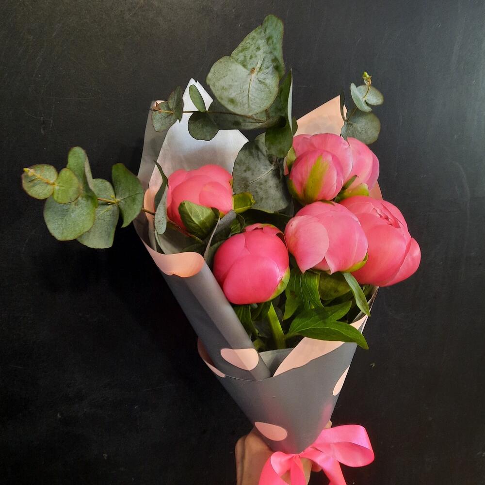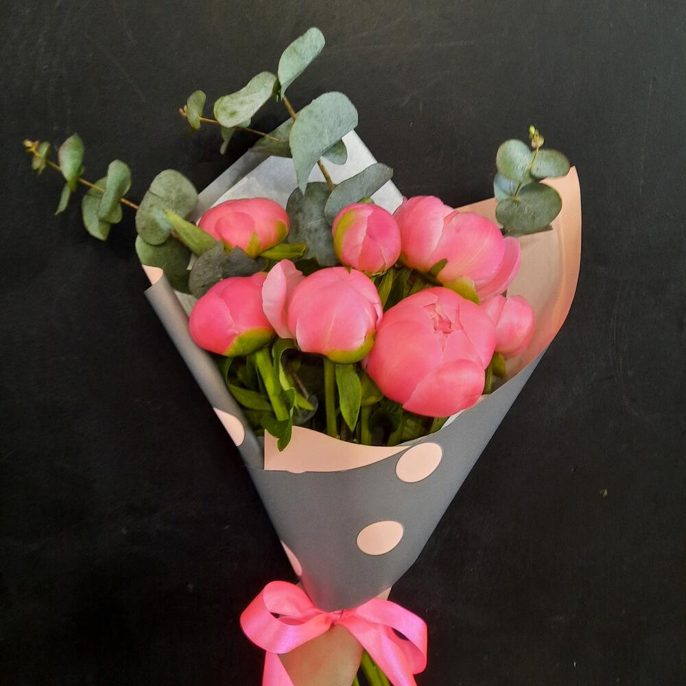 Букет из 7 коралловых пионов и ароматного эвкалипта в дизайнерской упаковке