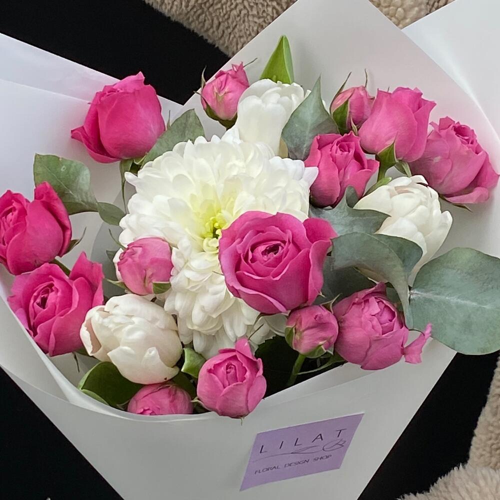 Кустовая роза – 10 шт. Тюльпан – 7 шт. Хризантема кустовая – 2 шт. Эвкалипт – 3 шт. Открыточка с вашими пожеланиями – 1 шт.