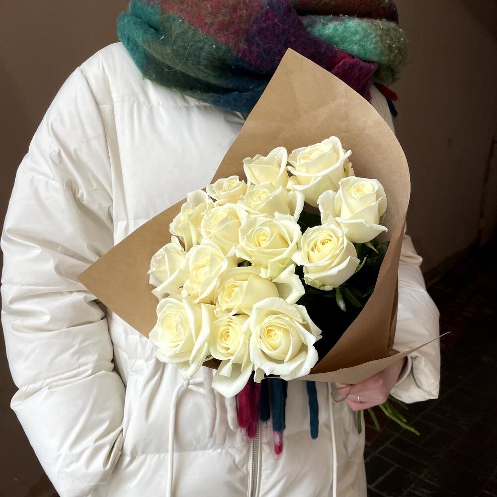 Крафтовая упаковка – 1 шт.Роза россия белая – 15 шт.