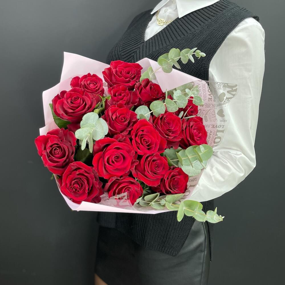 17 красных роз с эвкалиптом