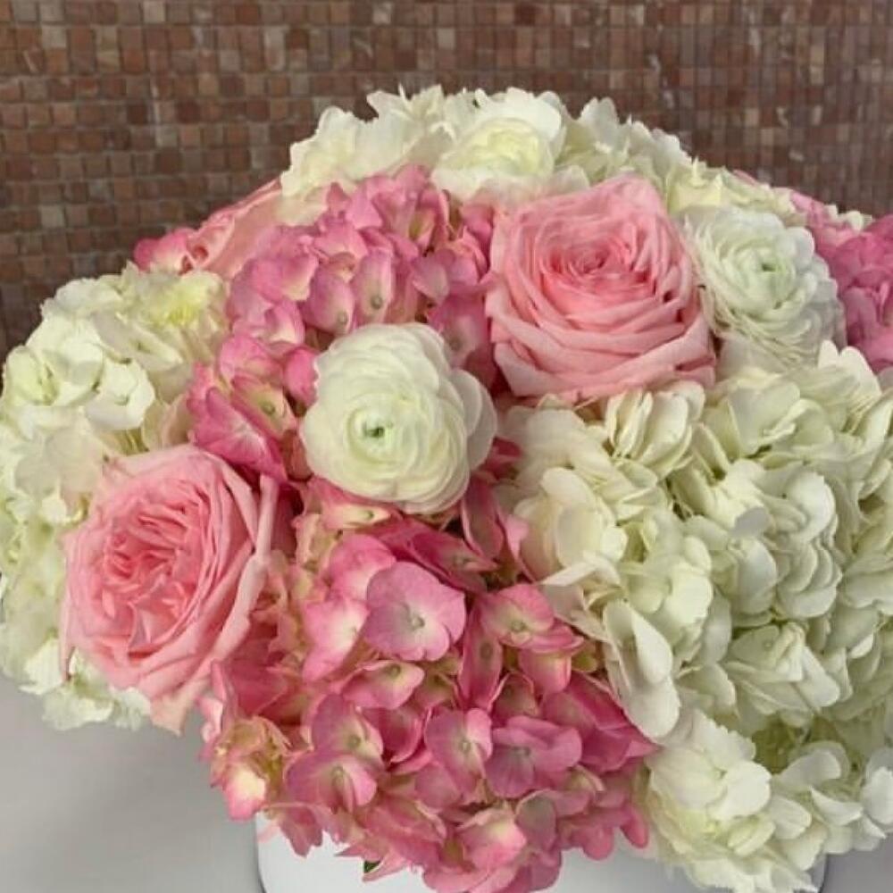 ассорти гортензий – 7 шт.Роза розовая – 5 шт.Ранункулюс – 5 шт.Коробка шляпная – 1 шт.Лента атласная – 1 шт.Открытка – 1 шт.инструкция по уходу за цветами – 1 шт.хорошее настроение – 100 шт.Кризал – 1 шт.