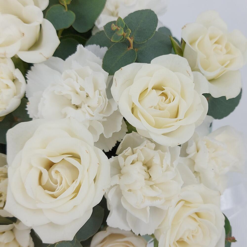 Белые кустовые розочки с эвкалиптом в коробке XS