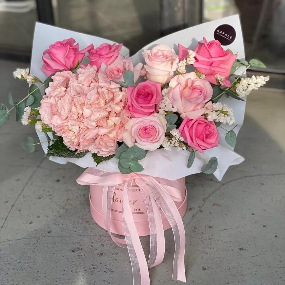 Сборный букет "BOX 21.0" состоит из 9 голландских роз, 1 голландской гортензии, 2 веток статицы и 2 веток эвкалипта в оформлении в коробку. Выбрав букет от RAFALE, Вы скрасите день обладательницы букета и подарите ей незабываемые эмоции.