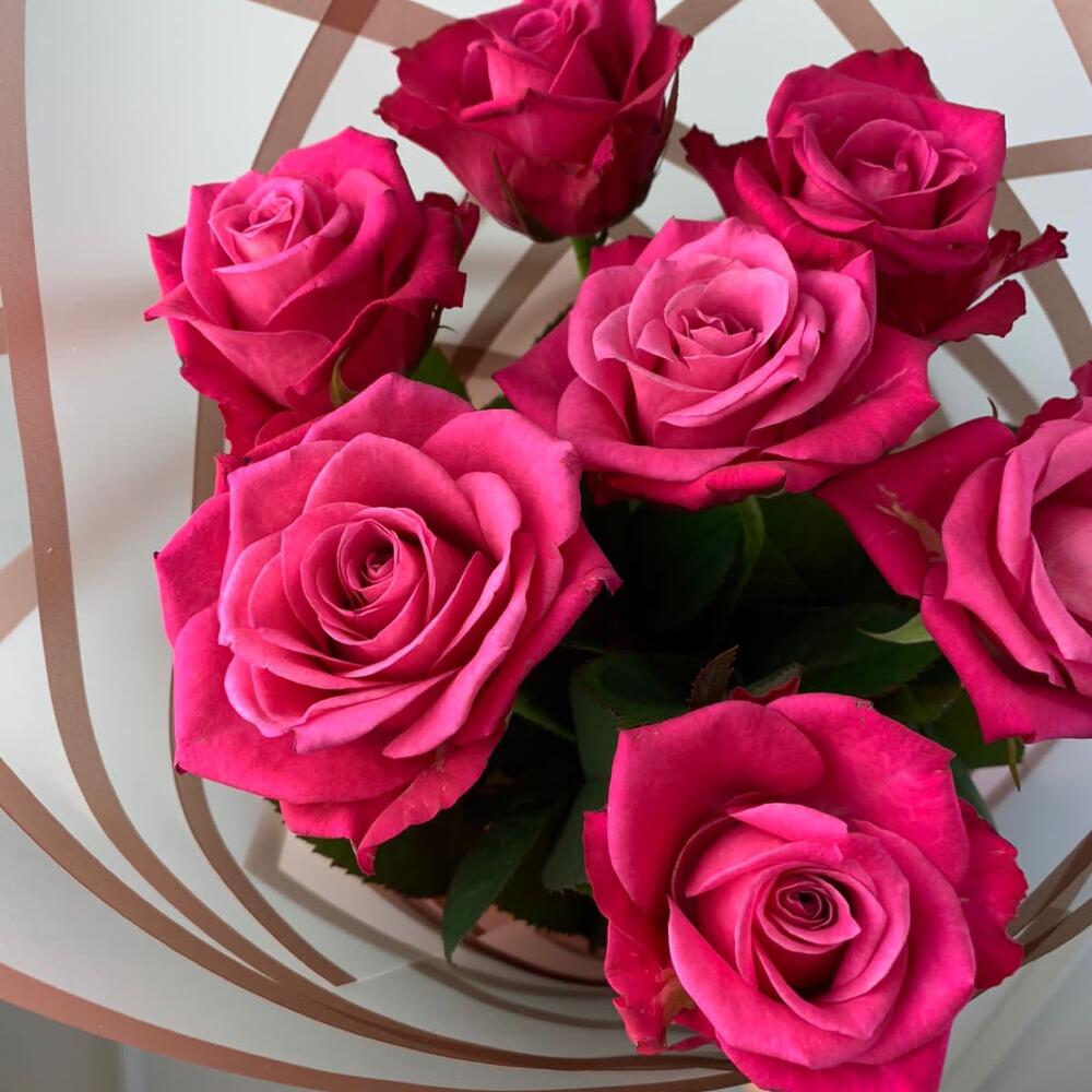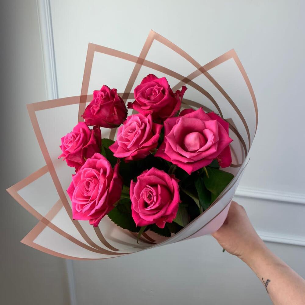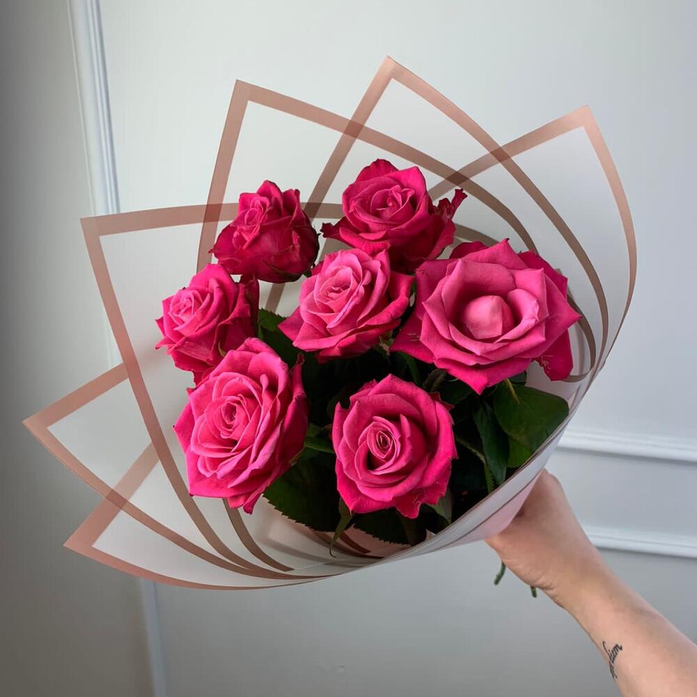 роза российская 40 см – 7 шт.Пленка дизайнерская – 1 шт.Лента атласная – 1 шт.