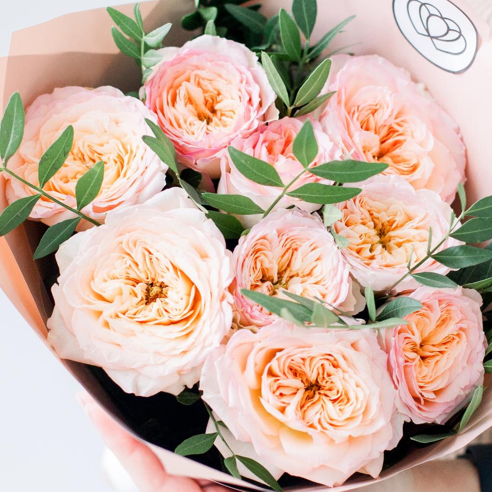 Букет из 9 персиковых пионовидных роз Flash Back 40 см c фисташкой в кремовой пленке